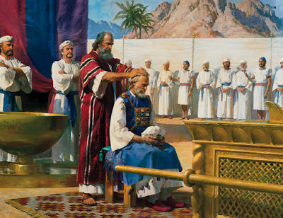 Al ser lavados, Aarón fue vestido con las vestiduras pedidas por Dios y después él y sus hijos fueron ungidos con aceite. En Levítico 8 aprendemos que antes de que los sacerdotes fueron ungidos, todo el tabernáculo también fue ungido con aceite. Nos da a entender que el santuario y los varones estaban siendo entregados al servicio de Dios.