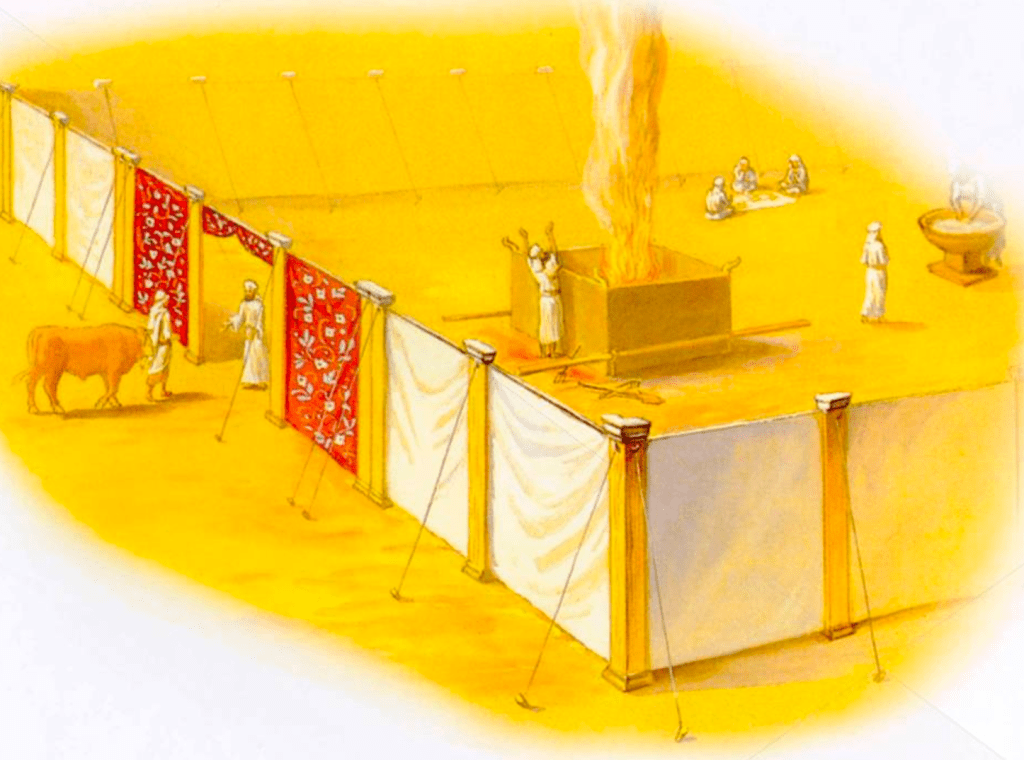Al lado Este del atrio del tabernáculo, se encontraba la única puerta por la cuál entraban los sacerdotes y los oferentes. La puerta era una cortina de 20 codos de ancho (10 m) y 5 codos de alto (2.5 m). La cortina colgaba de 4 columnas que estaban sobre 4 basas de bronce. Sus capiteles o ganchos y sus molduras eran de plata. La cortina era de 4 colores: azul, púrpura, carmesí y blanca.