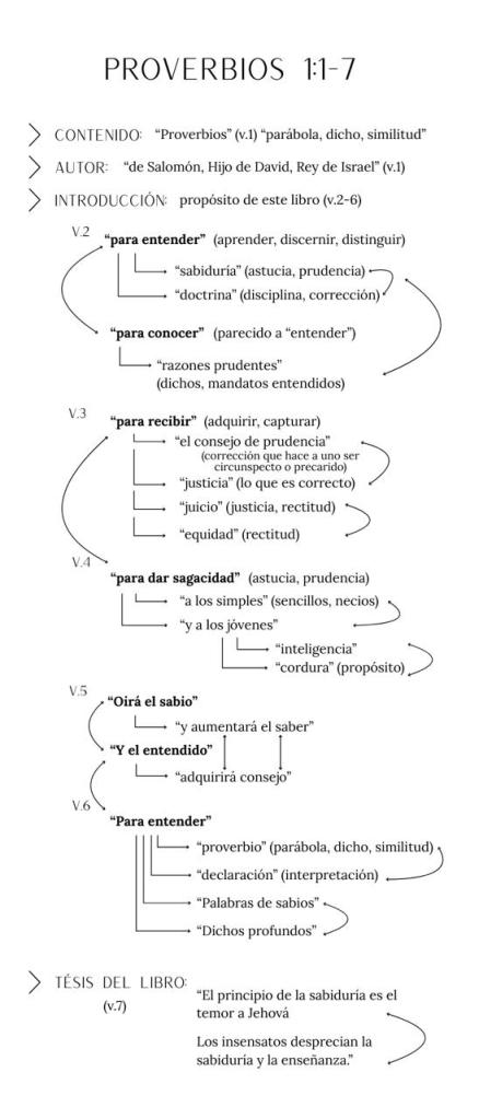 En Proverbios 1:2-7 se encuentra el prólogo del libro. Se especifica muy claramente el propósito del libro. Por ejemplo, dice el autor que es “para entender sabiduría y doctrina” (v.2) o también “para dar sagacidad a los simples” (v.4). A simple vista pareciera solo ser un número de palabras que son mencionadas sin un orden o una simetría. Pero no es así.
